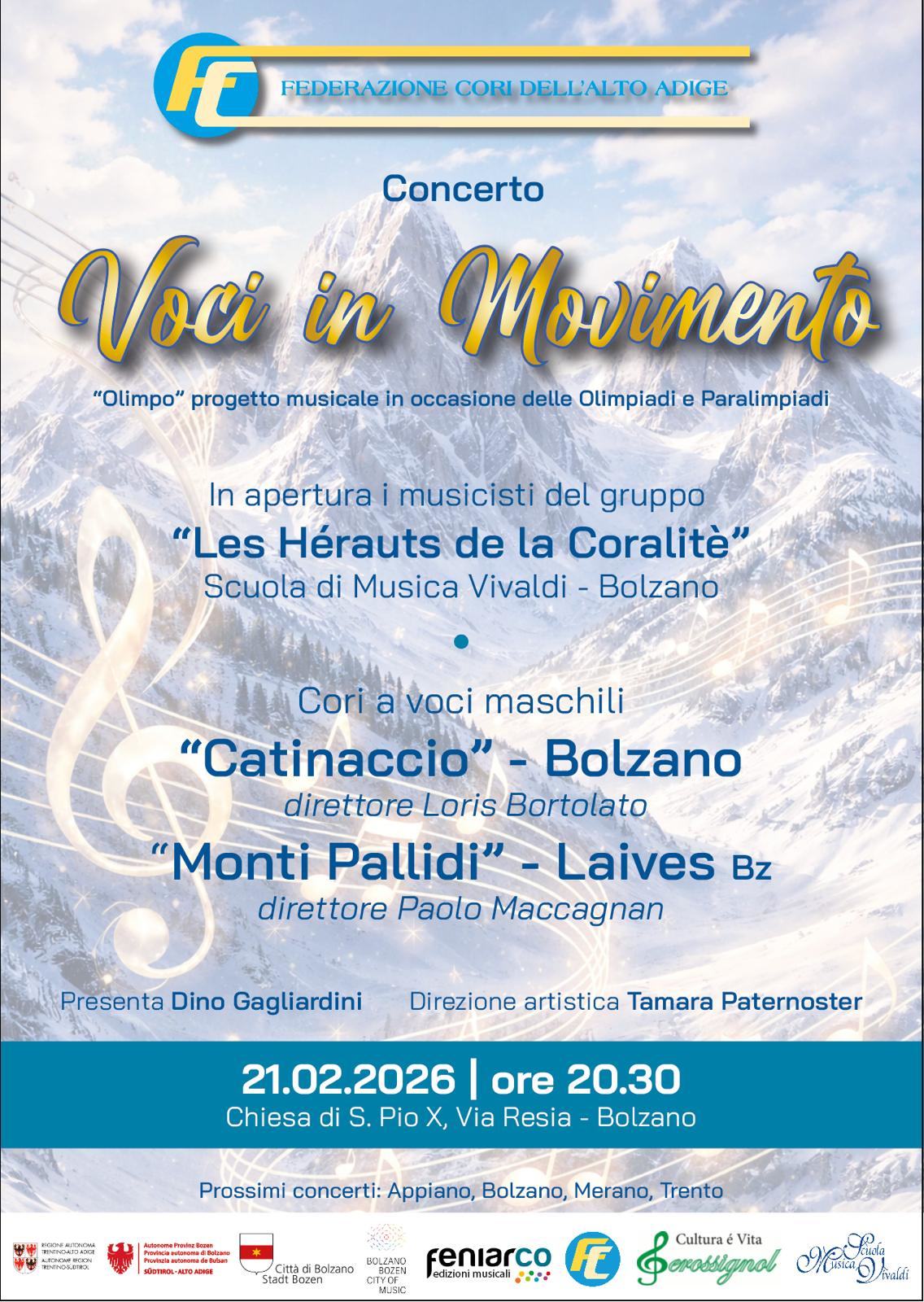 Il concerto Voci in Movimento si inserisce nel progetto musicale “Olimpo”, promosso in occasione delle Olimpiadi e Paralimpiadi, con l’intento di valorizzare il canto corale come espressione culturale e collettiva. L’iniziativa è proposta dalla Federazione Cori dell’Alto Adige e si svolge in un contesto artistico di particolare rilievo.