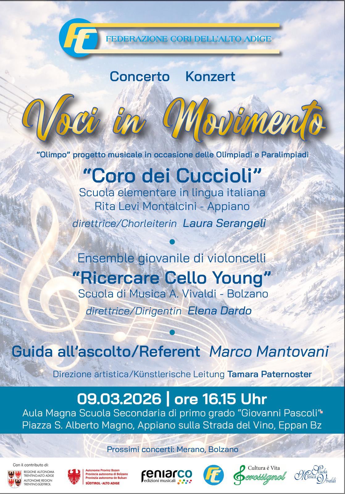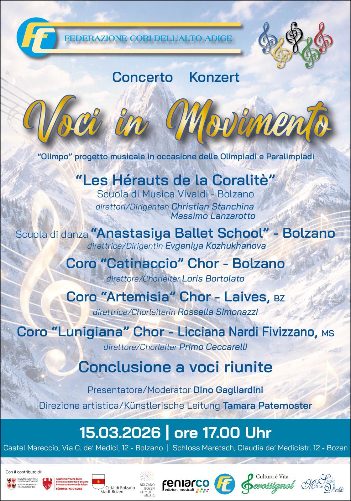 Il concerto Voci in Movimento si inserisce nel progetto musicale “Olimpo”, promosso in occasione delle Olimpiadi e Paralimpiadi con l’intento di valorizzare il canto corale come espressione culturale e collettiva. L’iniziativa è proposta dalla Federazione Cori dell’Alto Adige e si colloca in un contesto artistico di particolare rilievo.